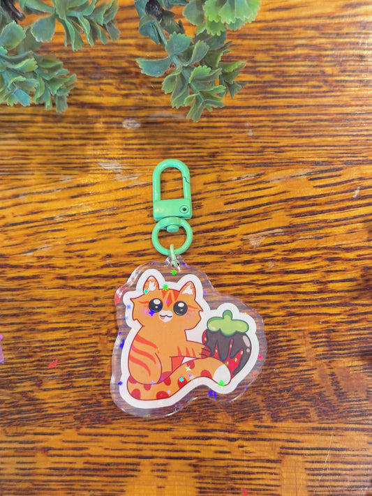 Silly Holographic Cute Cat Holding Chocolate Covered Strawberry Keychain